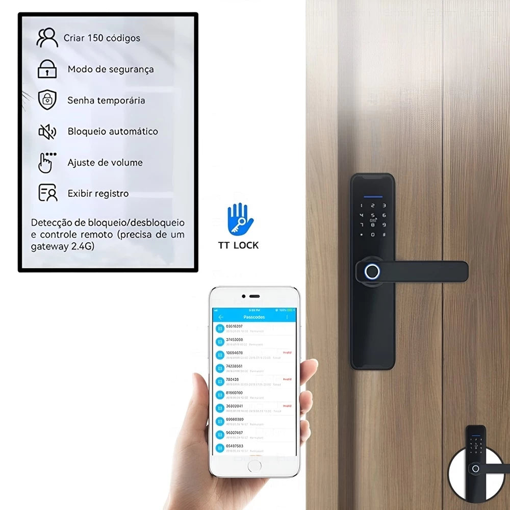 Tipos de desbloqueio: Impressão digital, senha, chave física, tag e App Bluetooth.